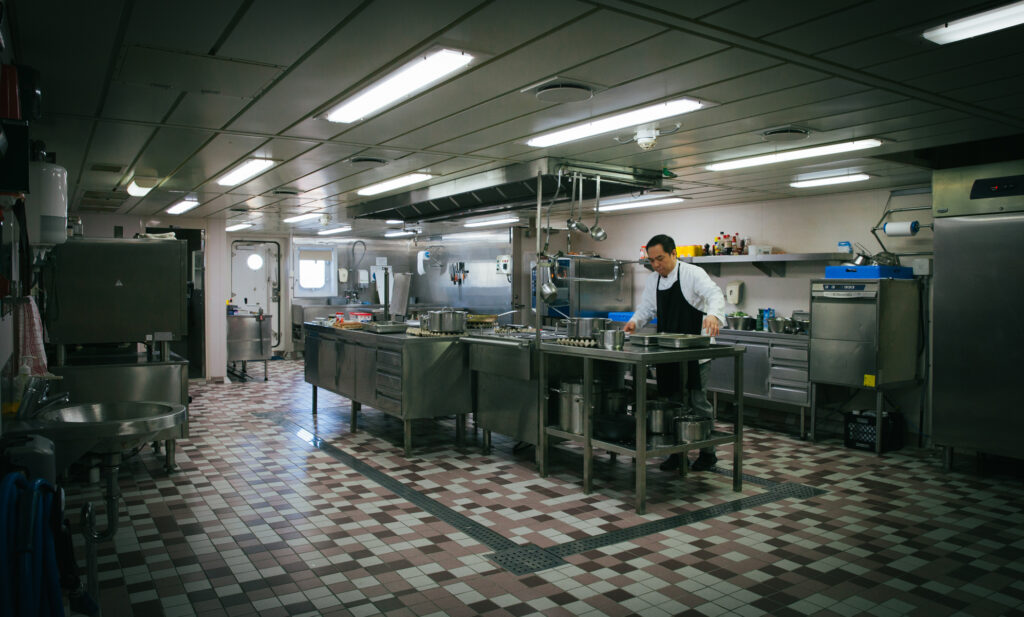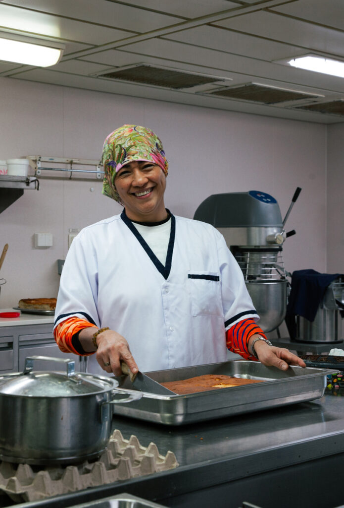 I den rymliga mässen doftar det ljuvligt av lasagne och grillad kyckling. Det är strax lunchdags och kockstewarden Kriston Go dela Paz står vid stekpannan och ser riktigt nöjd ut. Allt är enligt tidsschemat och efterrätten på gång, perfekt.