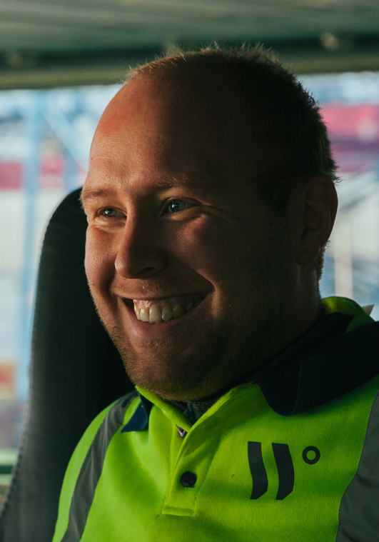 På lastbryggan stöter vi också på matrosen Henrik Pettersson, som just löst av matroskollegan Magnus, som mönstrade av i Göteborg idag. Henrik ser lite stressad ut när vi kommer och frågar om jobbet.