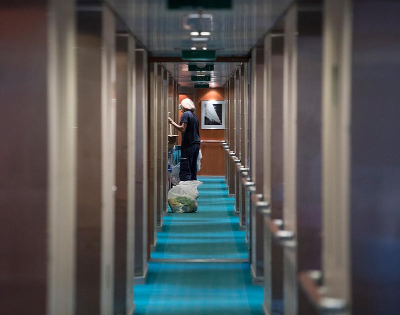 Håkan Ziethén har just gjort en runda för att fylla på varor i ombordshopen. Han hjälper också till med provianteringen för köket och baren samt påfyllning av sängkläder och annat i linneförrådet.